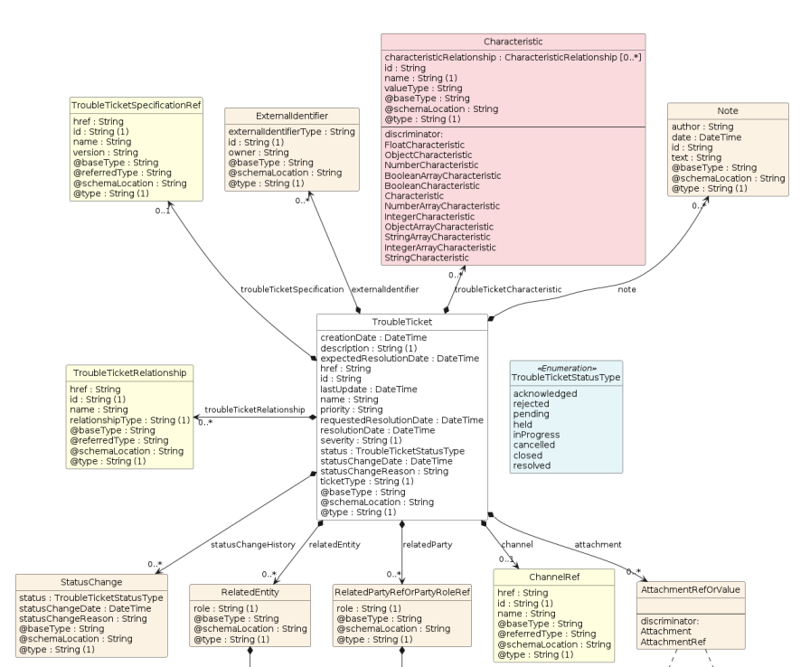 The Ticketing module illustrates this approach well. The diagram below shows the TM Forum Trouble Ticket data model as defined by TMF621 — the entity structure that tSM adopts and extends: