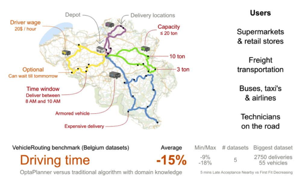 tSM Scheduler is based on OptaPlanner (AI constraint solver) and uses a VRP-TW planning approach.